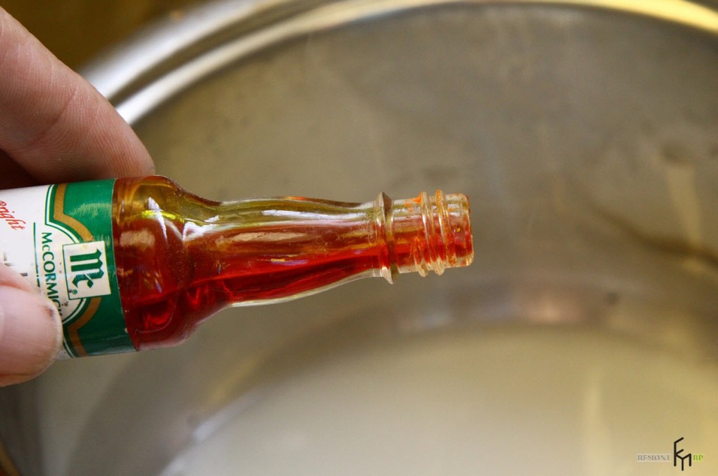 - Когда воск полностью расплавится и превратится в однородную массу, добавьте в него несколько капель пищевого красителя и, при желании, ароматического масла. Тщательно перемешайте, пока не получите нужный цвет: