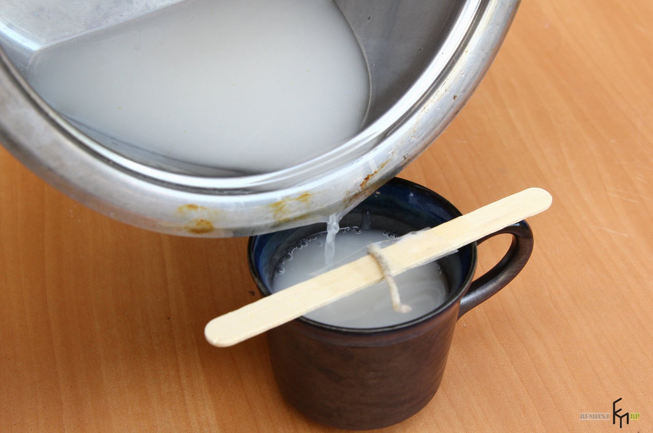 - Обязательно наденьте перчатки, чтобы не обжечь руки! Медленно, тонкой струйкой, чтобы не сдвинуть фитиль из центра, перелейте расплавленный воск в чашку: