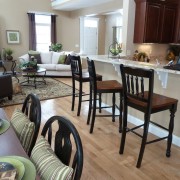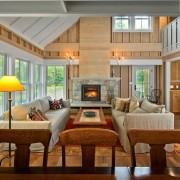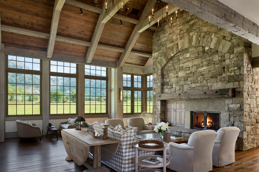 Красивый белый потолок, отделанный однотонными балками, визуально увеличит размеры комнаты, сделает ее просторной и светлой. Большие окна, выполненные из деревянных рам с множеством стекол создадут эффект присутствия на природе. Логично впишется в этот интерьер камин, отделанная натуральным камнем большая стена дополнит гармонию пространства. В целом гостиная позволит вам почувствовать себя спокойно и комфортно.