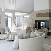 Превосходно смотрится гостиная, отделанная в стиле модерн. Сочетание камина, строго вписанного дизайнером в интерьер в светлых серых тонах, акцентирует внимание на этом элементе. Пол, имитирующий грубую деревянную доску, вносит элемент экостиля. Рассеянный свет из многочисленных светильников на потолке, диваны под широкими светлыми окнами раскрывают характер хозяина, человека урбанистического образа жизни, стремящегося к гармонии природы. В результате переплетение стилей дало эффектный результат современного решения для отдыха и приятных бесед.