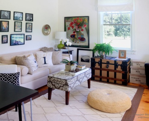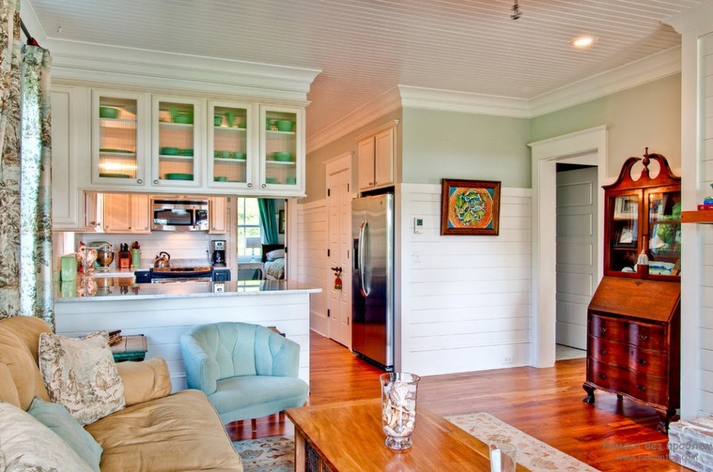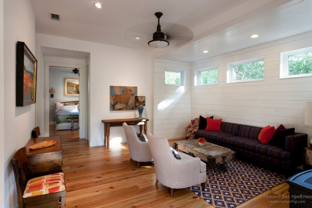 Второй пример – отделка в классическом стиле с элементами кантри. Небольшие деревянные окна – как в старинном доме, балки, укрепляющие конструкцию, цвет натурального дерева выдержан во всей палитре интерьера. Усиливают ощущение старины декоративные подушки с орнаментом, уютно расположенные на диване по центру гостиной. Все функционально – лишних элементов почти нет. Открытые полки для мелких вещиц украшают стену.