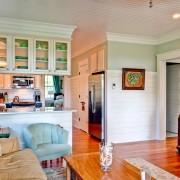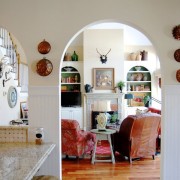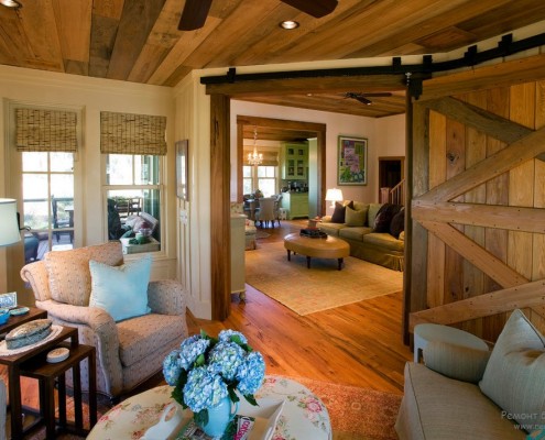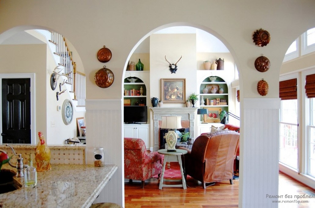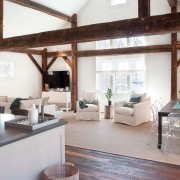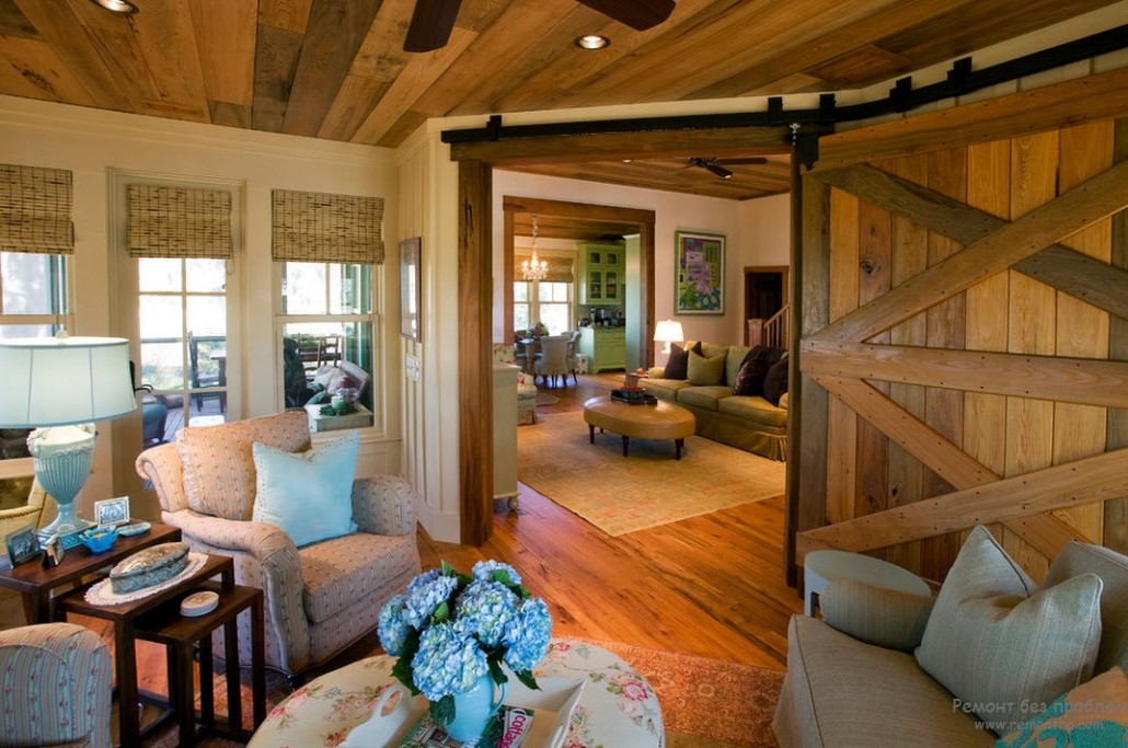 Очень интересное решение применения деревянных конструкций, поддерживающих всю гостиную, выполнен в стиле кантри. Белые окрашенные стены и потолок оборудованы каркасом из деревянных балок контрастного цвета натурального дерева. Это решение создает ощущение основательности защищенности, при нарочитой простоте дизайнерских элементов. Потолок, куполом, уходящий вверх, визуально увеличивает помещение, прозрачные стулья наполняют воздушностью гостиную, залитую солнечным светом, попадающим через большое окно.
