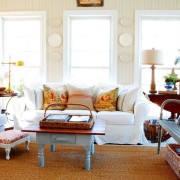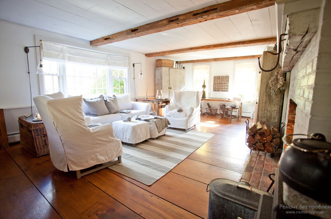 Для оформления гостиных с применением деревянных балок подходит стиль кантри, оформленный с использованием натуральных тканей для декорирования мебели. Ковровые покрытия для пола стилизованы под рогожу или коврики, выполненные по старой ткацкой технологии из грубых ниток. Хорошо смотрятся в отделке льняные изделия – это могут быть скатерти, полотенца или чехлы для мебели – что также является элементов моды прошлого столетия. Полы в таких гостиных делают из крашеных деревянных досок, окрашивать полы и балки в один цвет – очень эффектно, подчеркнете стиль помещения и обозначите акценты на деталях. Камин хорошо впишется в такой интерьер, излучая тепло и даря огонь домашнего очага.