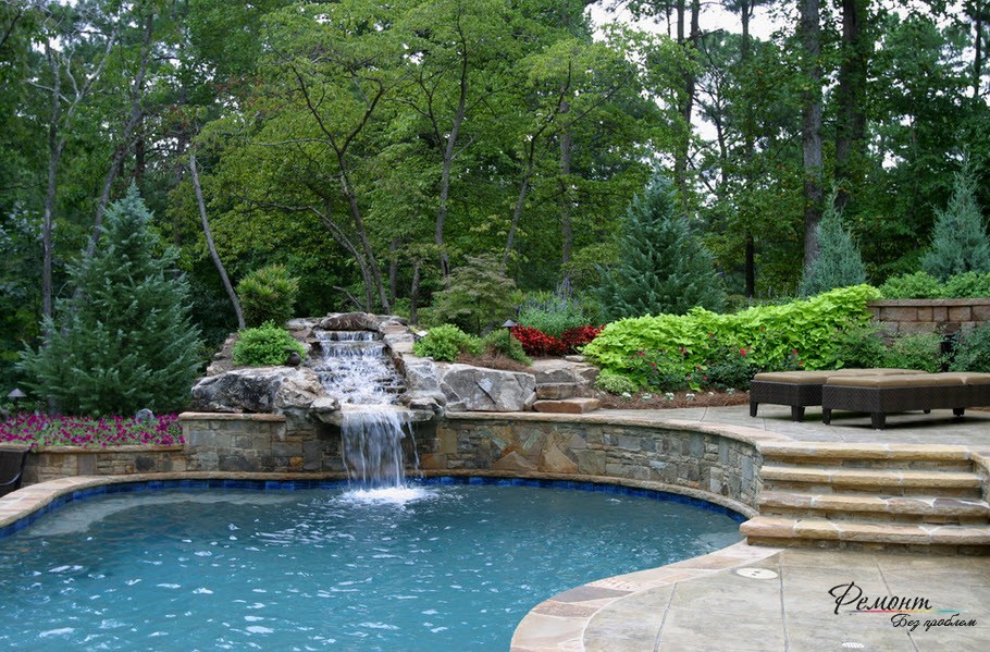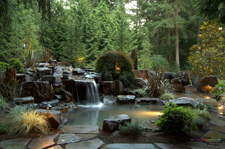 Водопад или каскад наиболее гармонично впишется в ландшафтный дизайн вашего участка, если разместить его на искусственно созданной возвышенности или же на берегу водоема. Зачастую используются искусственные преграды в виде камней, а способ их укладки, как и форма, могут быть различными, смотря что подойдет именно вам.