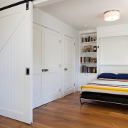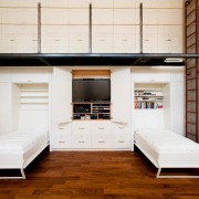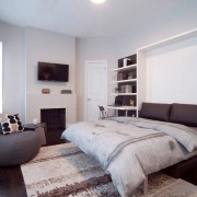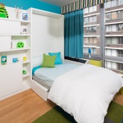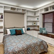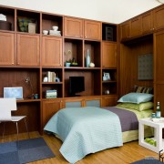 Расположить шкаф со встроенной кроватью можно вдоль узкой стены и, оставив достаточное место для опущенного спального места, расставить в комнате остальную мебель. Стоит также отметить, что сам шкаф может быть угловой, что позволит создать достаточное количество полок и ящиков для хранения личных вещей. Если ширина комнаты позволяет, то шкаф со встроенной кроватью отлично впишется и вдоль большей стены, главное лишь правильно рассчитать, сколько места будут занимать другие желаемые предметы мебели. В том и другом случае следует учитывать расположение дверей и окон, чтобы в ночное время при разложенной кровати можно было легко перемещаться по комнате.