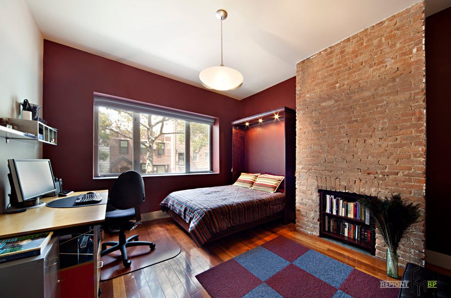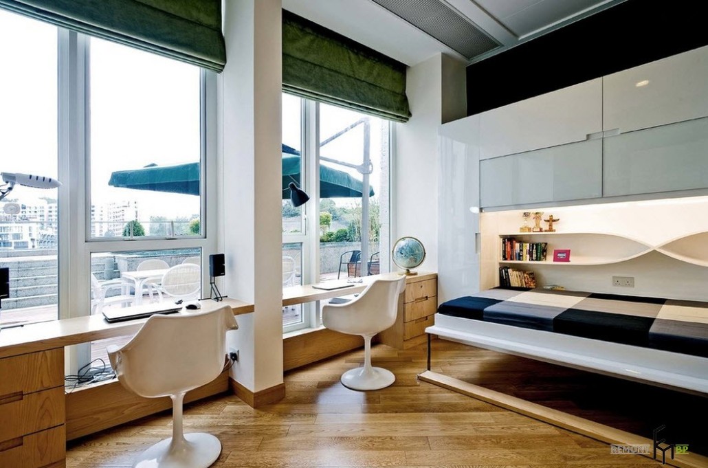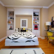 Уместным будет такое решение и в подростковой комнате, особенно если ребенок занимается каким-то искусством, ведь сложив спальное место в шкаф, из комнаты выйдет настоящая творческая мастерская. Для создания такого интерьера следует лишь правильно подобрать предметы мебели для рабочей зоны. Большое кожаное кресло и стеклянный стол современного дизайна будут очень уместны.