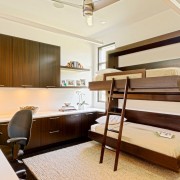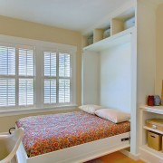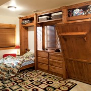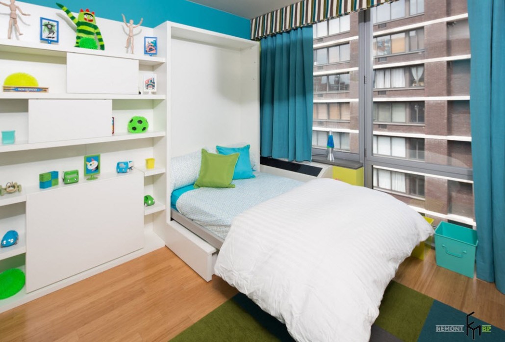 Идея встроенной кровати окажется хороша и в детской комнате. Ведь это то место, где ребенку нужно достаточное пространство для игр. Особенно актуальным решение станет, если в небольшой комнате живет двое детей. Поставив большой шкаф с двумя встроенными кровати вдоль одной из стен легко можно обустроить детям и рабочее место, и зону для игр. А для того чтобы ребенок сам мог разложить свою кровать, лучше отдать предпочтение конструкции с боковым положением.