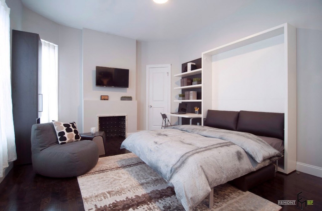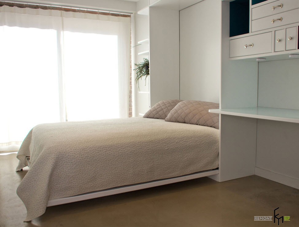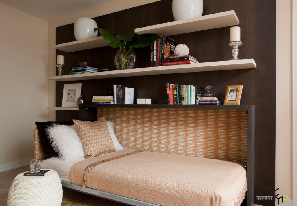 Только представьте, в такой гостиной следует поместить небольшой диванчик и кресло, столик с телевизором шкаф и кровать. При таком раскладе в лучшем случае в помещении останутся узкие проходы между элементами мебели. И в таком состоянии комната будет казаться как минимум неуютной. Другое же дело, если спальное место будет опускаться на пол лишь на ночь, а днем эти квадратные метры будут свободные.