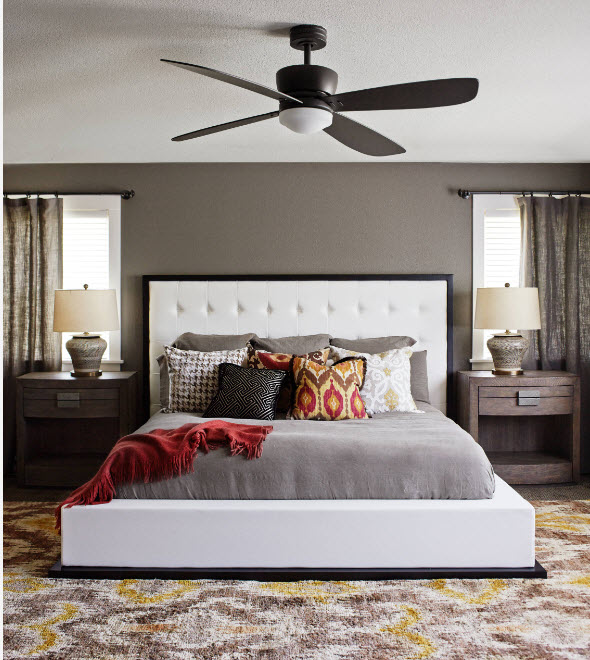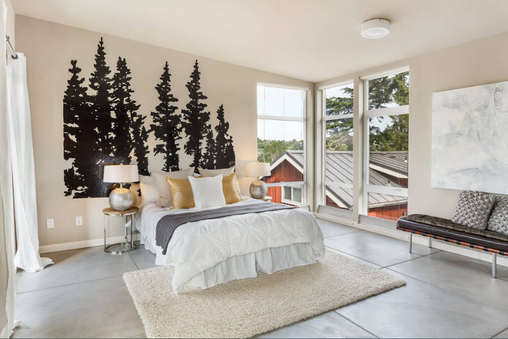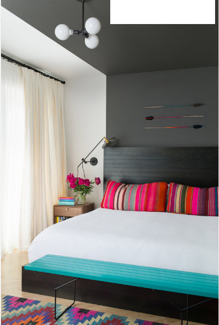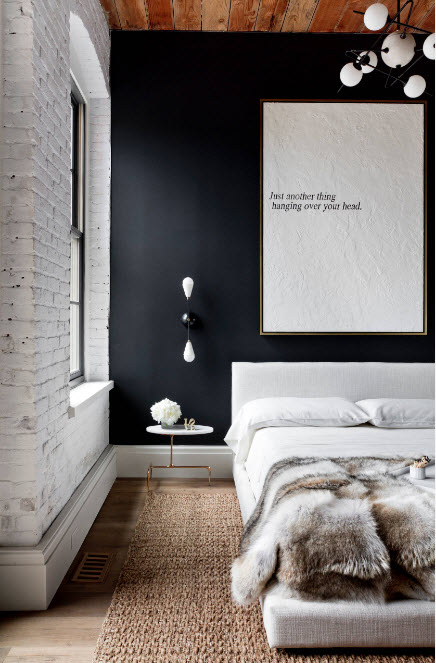 Черный цвет в качестве цветового акцента спальни? Почему бы и нет. Если геометрия вашей спальни идеальна (создана при помощи гипсокартонных конструкций или при помощи штукатурного выравнивания), то контрастное сочетание темной акцентной стены со светлым фоном остальных поверхностей создаст не только центр фокусировки внимания, но и подчеркнет конструктивизм помещения.