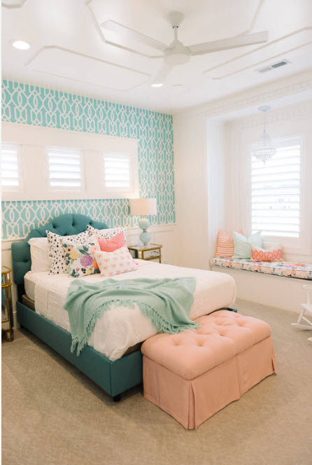 Перед вами пример использования обоев с ярким, колоритным рисунком в небольшой спальне. Помимо того, что с помощью такой отделки можно создать мощный цветовой акцент в светлом и достаточно нейтральном помещении, рисунок обоев может выступать в качестве мотива применения определенного стиля оформления помещений. Тропический стиль в городской квартире – не только смелый, но и весьма оригинальный способ создания запоминающегося интерьера со своей изюминкой.