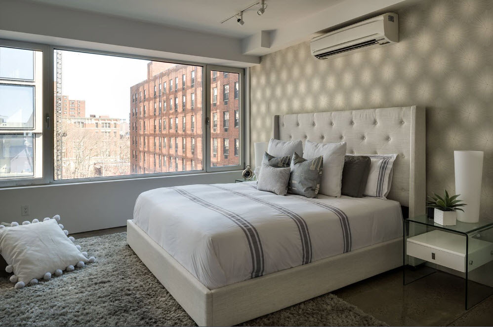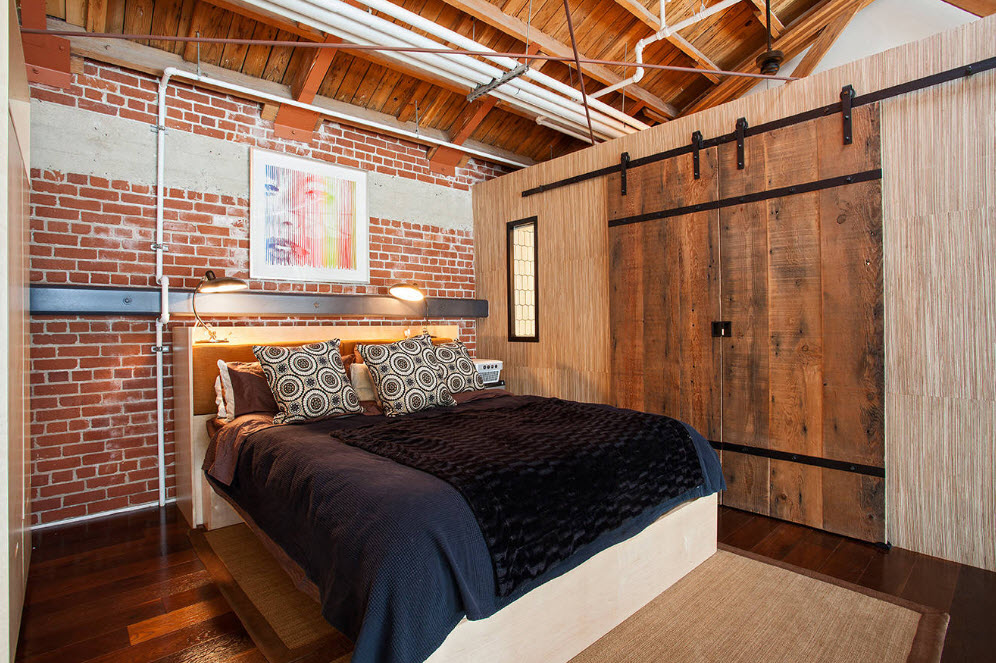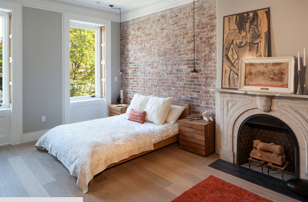 Кирпичная стена давно стала неотъемлемой частью создания оригинального интерьера с нотками индустриализма. Помещение спальни не стало исключением. Некоторая брутальность, которую привносит с дизайн спального пространства кирпичная стена, преображает интерьер, меняет его характер. Смелые дизайнеры и их заказчики используют непосредственно кирпичную кладку в качестве основы создания акцентной поверхности, лишь обработав ее необходимыми защитными спреями. Для более консервативно настроенных домовладельцев возможен вариант частичного или полного «выбеливания» поверхности из кирпичей. В любом случае, фактурность кирпичной кладки, ее специфичность, привнесут в дизайн спальни нотки оригинальности.