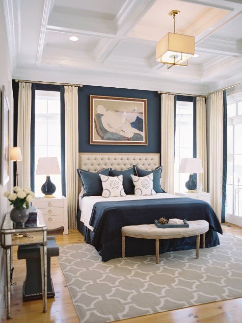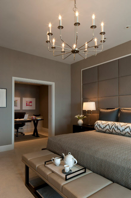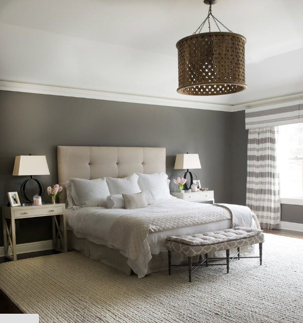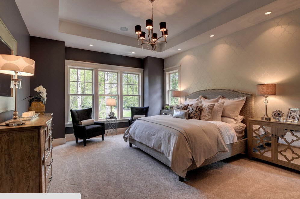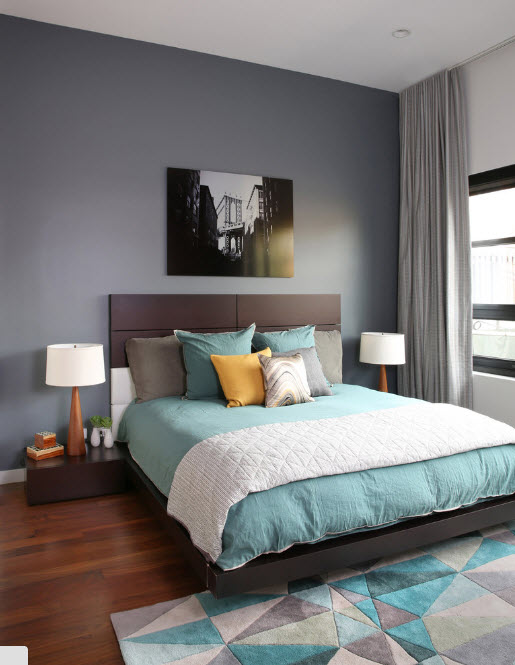 Если говорить о сочетании цвета стен с палитрой исполнения основной меблировки, то и в этом случае принцип действия достаточно прост. Чтобы создать некоторую контрастность и подчеркнуть ключевые элементы интерьера используйте сочетание темных и светлых тонов. Если вам необходимо просто освежить отделку спальни, не меняя в ней меблировку, которая выполнена из темных пород древесины или окрашена в колоритные цвета, то светлые стены станут прекрасным фоном для создания акцента на мебельный ансамбль. Если же вы планируете (или уже совершили) покупку мебели в светлых и даже белых тонах, то для стен имеет смысл использовать более насыщенные цвета (но не яркие, по крайней мере, в совокупности).