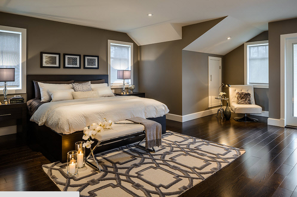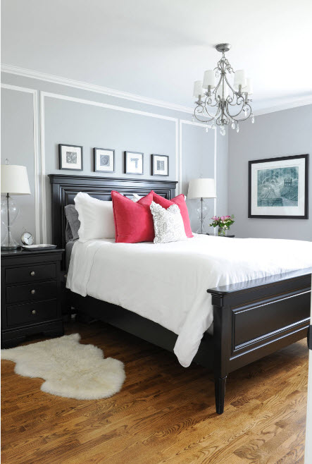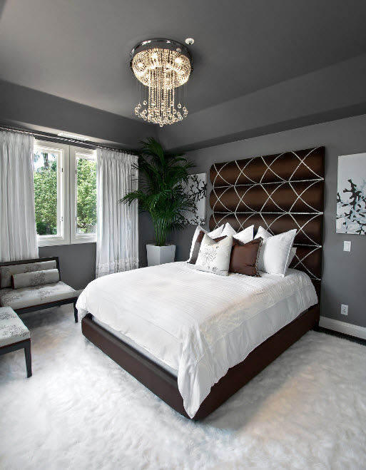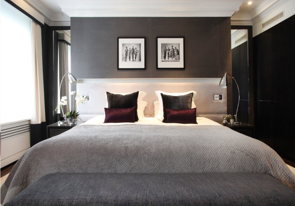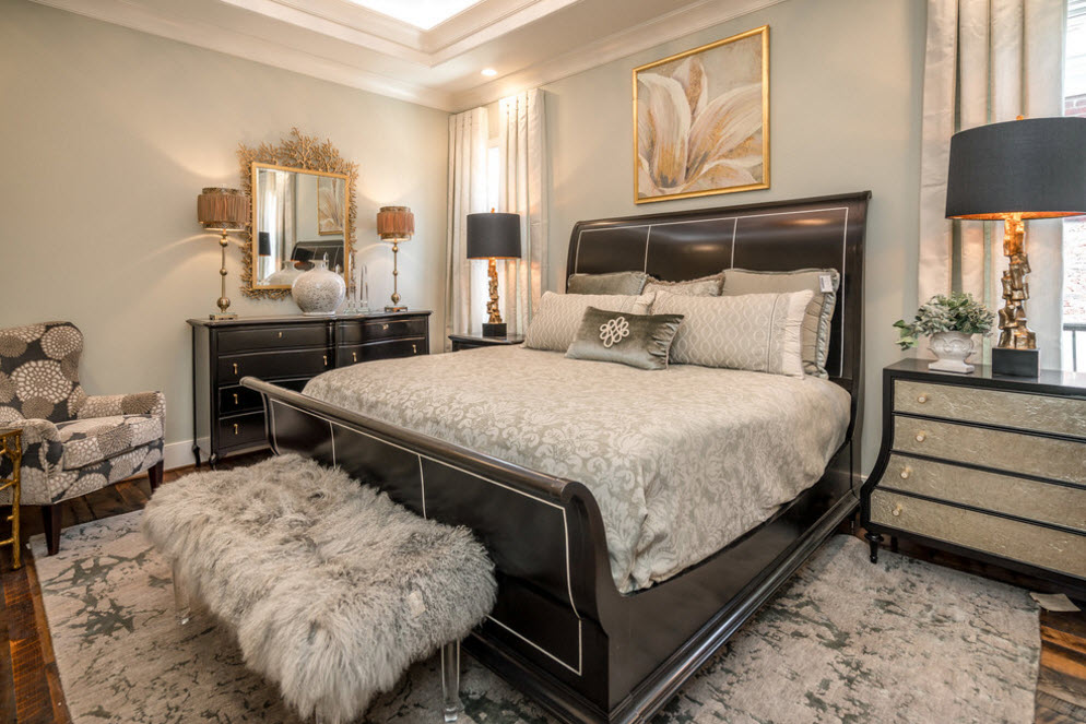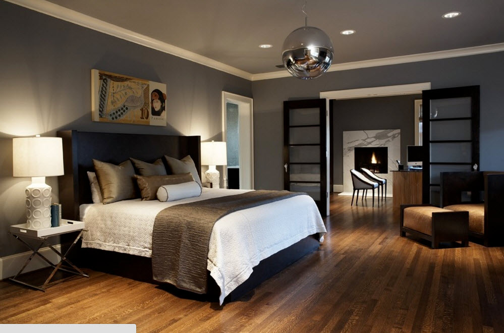 Второй вариант использования различных оттенков серого цвета в интерьер спальни – сочетание с темной меблировкой. На фоне светло-серых стен черная кровать и дополнительная мебель будут смотреться величественно и контрастно. В этом случае теплые оттенки проще всего привнести с оформление полов. Паркет или напольная доска с колоритным природным рисунком древесины станут эффектным дополнением.