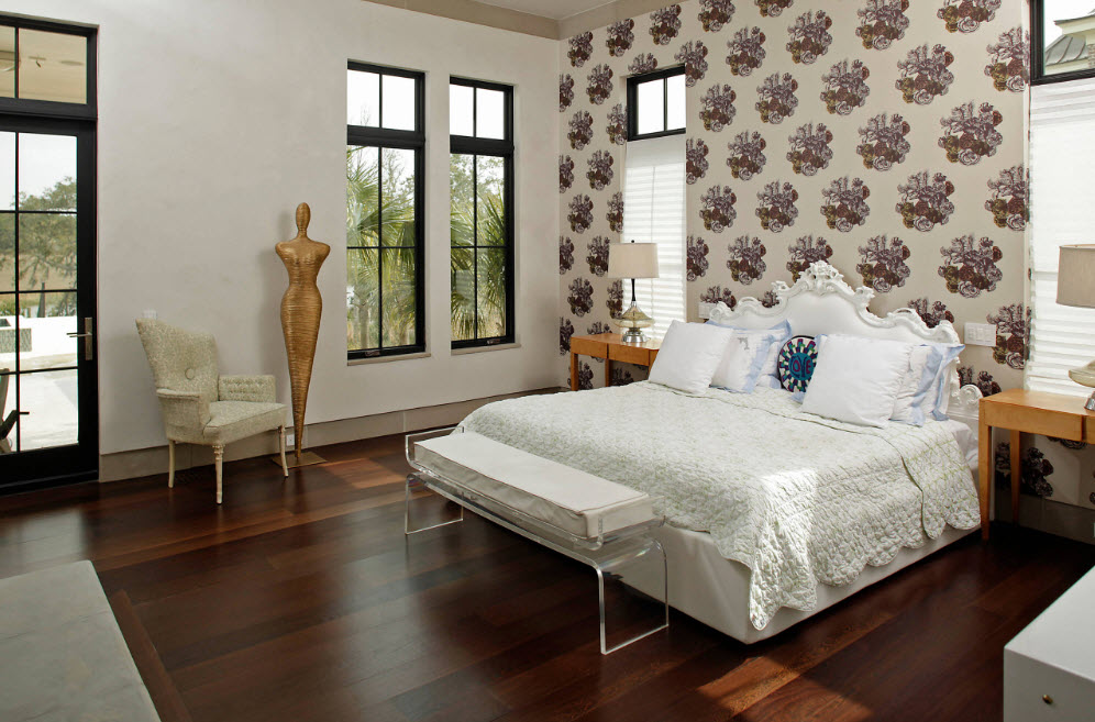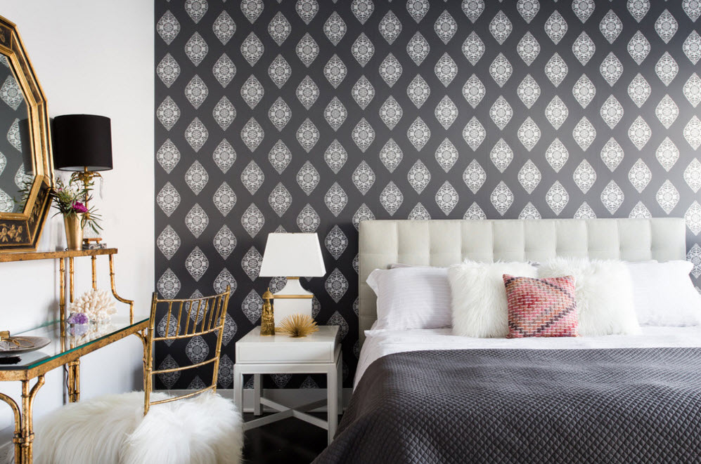Где как не в спальне использовать обои в качестве основного отделочного материала? Обилие цветовых и фактурных решений, многообразие принтов и расцветок позволяет найти свой вариант каждому владельцу квартиры или дома для создания интерьера своей мечты. Если говорить о современных способах применения этого вида отделки в спальных помещениях, то принтованные обои чаще всего используются для отделки только одной стены и ею, как правило, выступает плоскость за изголовьем кровати. Именно здесь вы можете не беспокоиться о том, что яркий принт или пестрый орнамент станут источником возникновения бурных эмоций в помещении, глее нам чаще всего необходимо расслабление и покой. Оформляя акцентную стену при помощи колоритных обоев, вы привносите оригинальность в интерьер спальни, не рискуя атмосферой умиротворения.