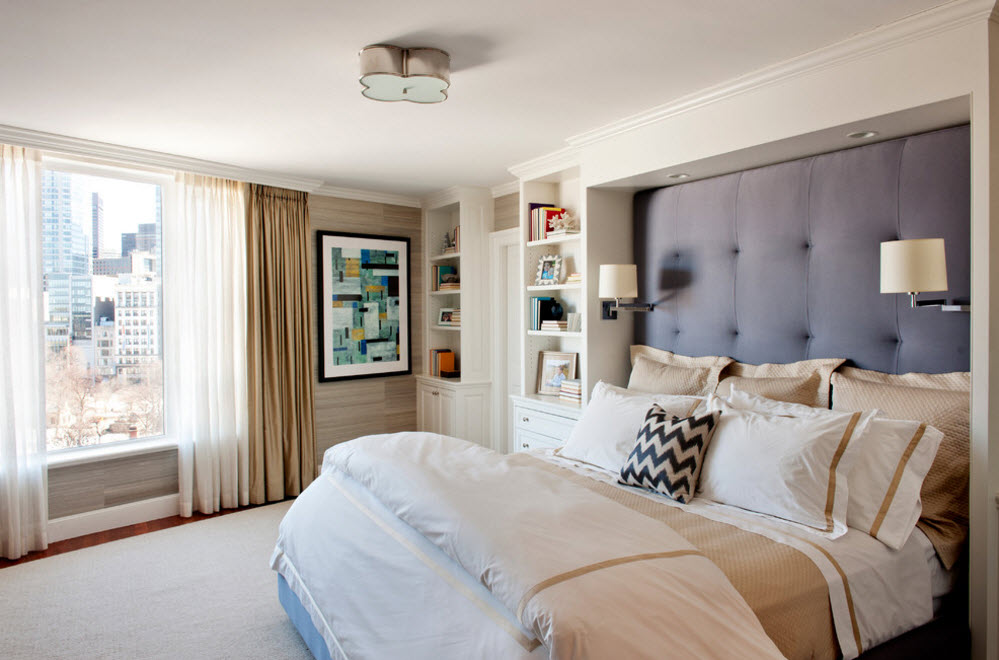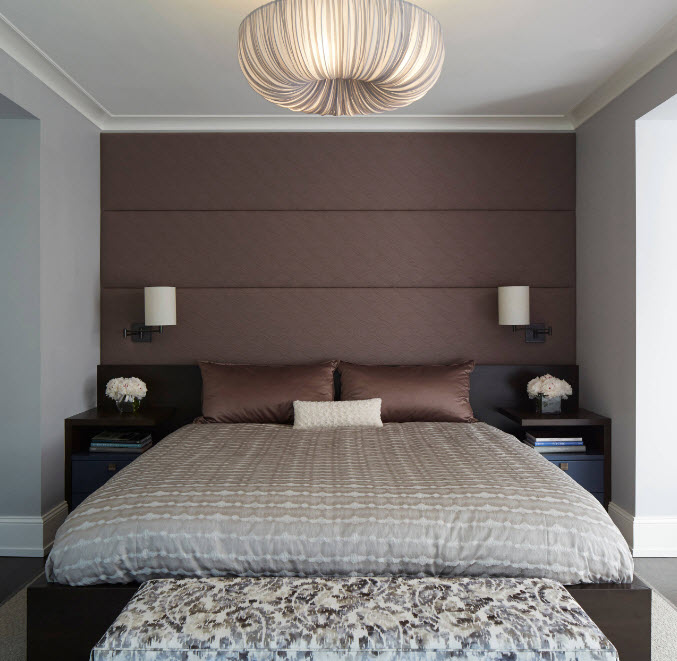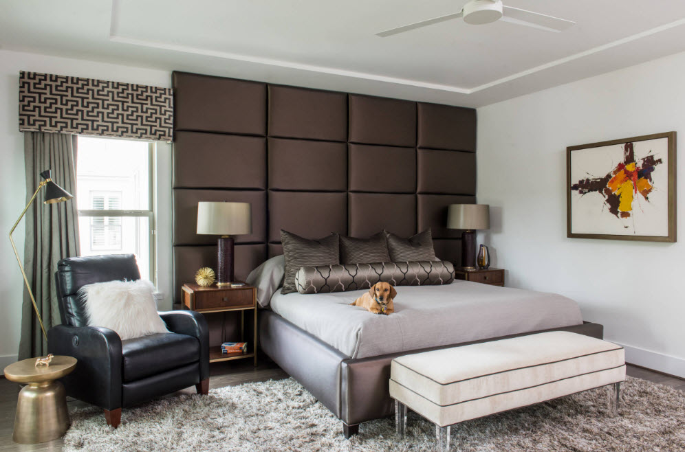 Мягкие настенные панели или тканевая (кожаная) обивка – вариант для создания непросто акцентной стены, но и безопасного, комфортного оформления изголовья кровати. Вы можете оформить с помощью мягкой обивки лишь часть стены над кроватью или отдать под текстильную отделку всю поверхность. Все зависит от размеров самой комнаты и габаритов спального места. Само по себе оформление и так оригинально, поэтому нет необходимости привлекать к нему еще больше внимания, использовав орнамент или принт – дизайнеры рекомендуют однотонные цветовые решения.
