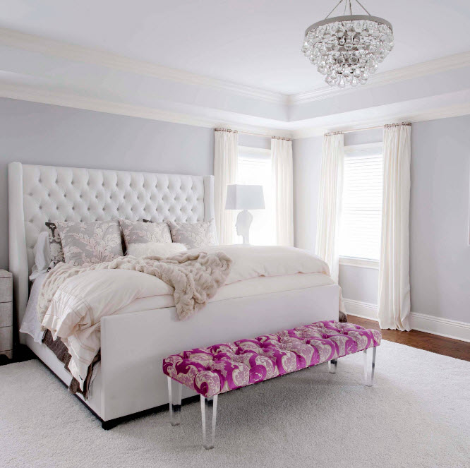Некоторые дизайнеры предлагают использовать исключительно белый цвет для оформления поверхностей комнаты и исполнения меблировки. Безусловно, для очень скромных по размерам помещений такой подход станет способом визуального расширения пространства и создаст свежий, легкий образ интерьера. Но будет ли в такой комнате уютно? Специалисты рекомендуют разбавлять белоснежный дизайн спальни поверхностями и элементами теплых древесных тонов – напольное покрытие, основная или вспомогательная меблировка, оформление окон и дверей, даже осветительные приборы.