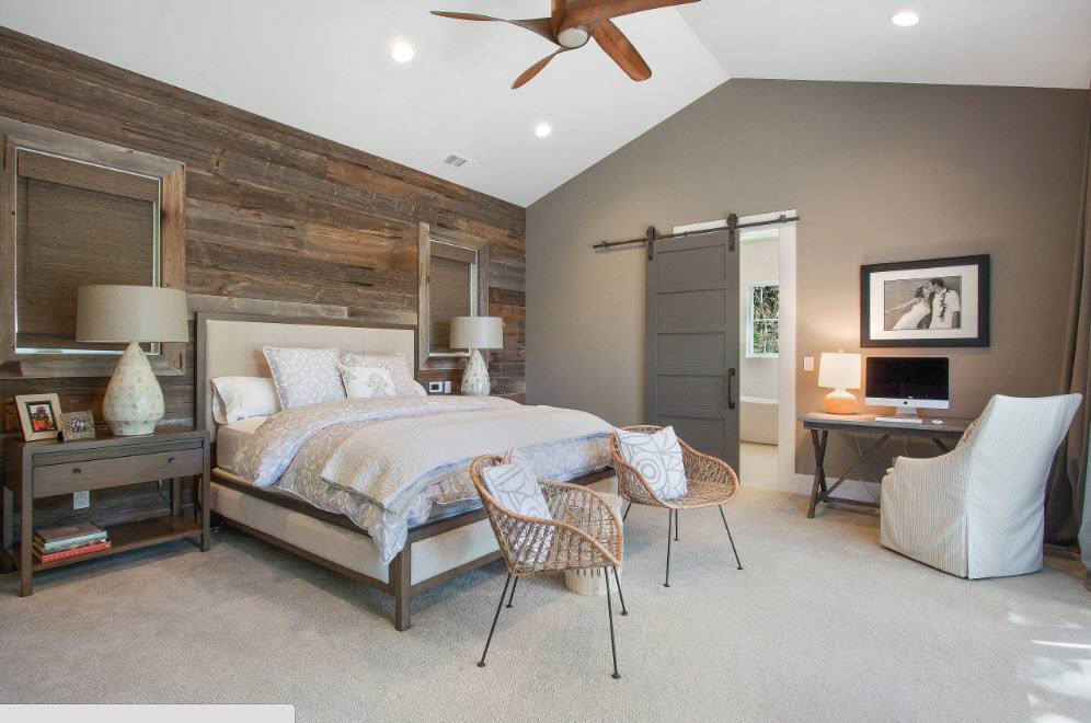 Рассмотрим сочетание цвета стен и мебели более конкретно. Столь популярная в наши дни серая цветовая гамма в качестве отделки помещения является для многих владельцев квартир и домов отличным выходом из положения. Нейтральные, светлые оттенки серого в отделке стен прекрасно сочетаются с любым исполнением потолка и напольного покрытия, становятся отличным фоном для настенного декора и практического любого текстильного оформления. Но полученную цветовую гамму помещения можно назвать прохладной. Привнести столь необходимую теплоту в образ спальни поможет мебель из натурального дерева. В подобной обстановке меблировка с красивым природным рисунком древесины становится не только основным элементом интерьера, но и его акцентом.