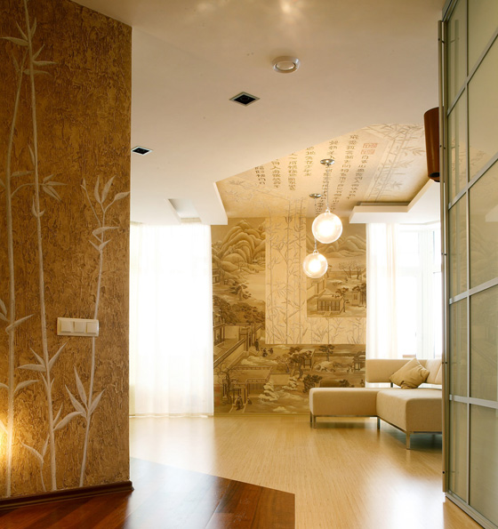 - декор из бамбука на стенах, выложенный в виде иероглифов;