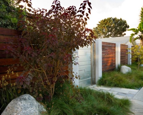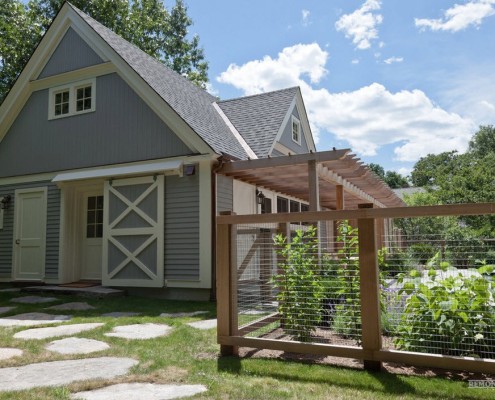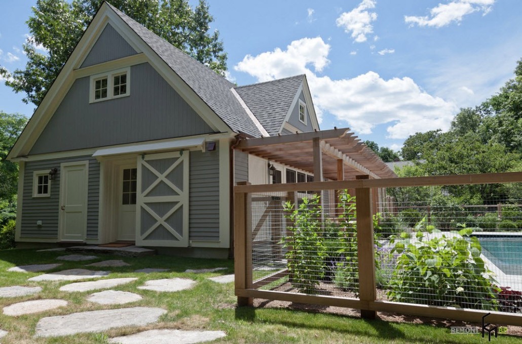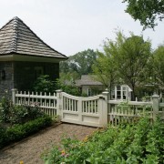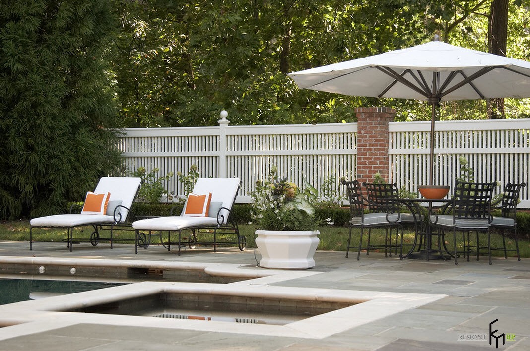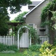 Конструкция некоторых беседок и пергол предполагает слияние с забором на участке. Чтобы получившееся строение не выглядело громоздким его можно окрасить в белый цвет и использовать для декора вьющиеся растения.