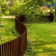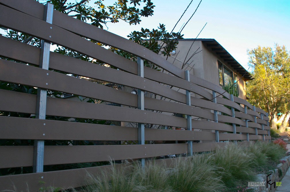 К современным изделиям можно отнести композит из дерева с полимером. Такой забор прослужит дольше, чем чистая древесина. При этом он требует меньше ухода, не боится перепадов температуры и солнечных лучей. Внешний вид такой конструкции не уступает аналогам из других исходников. В тоже время древесина потребует от своего обладателя тщательного ухода: обработки антисептиком, покраски, покрытия лаком. Это объясняется меньшей выносливостью материала по сравнению с кирпичом или металлом.