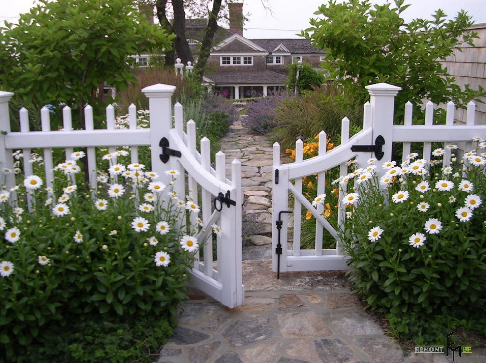 Цветная краска может сотворить чудо и из унылого частокола сделать яркий и веселый забор. Некоторые отходы производства вроде старых покрышек или банок могут стать декоративным дополнением для такого ограждения. Элегантности участку добавит белый забор. Он привлекает внимания и освежает обстановку.