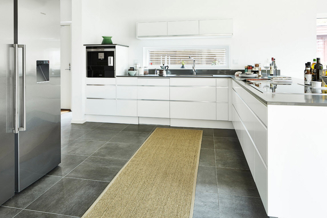 Рядом с гостиной находится не менее светлое помещение кухни. Белоснежные стены сливаются с таким же оттенком кухонного гарнитура, и лишь блеск нержавеющей стали бытовых приборов и столешниц рабочих зон оттеняет белизну меблировки. Гармоничное сочетание цвета напольной облицовки и нержавеющих поверхностей огромного холодильника, продолжают этот белоснежно-серый альянс.