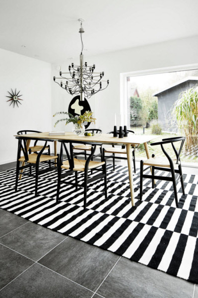 Еще одно помещение первого этажа – столовая, чей интерьер также может похвастать большой контрастностью. Здесь мы видим повторение отделки предыдущих функциональных помещений – белоснежные потолок и стены, совместно с керамогранитной плиткой в качестве напольного покрытия. А вот мебель и декор представлены в более контрастных решениях – сочетание светлой древесины и элементов черного цвета в меблировке обеденной группы выглядит очень эффектно. Полосатое ковровое покрытие, настенный декор и большая люстра оригинального дизайна производят не менее яркое впечатление.