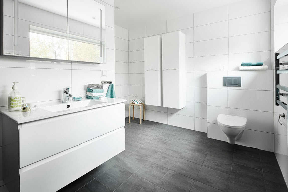 В утилитарных помещениях все тот же свет и свобода перемещения. Даже многофункциональные пространства сохраняют ощущение простора, благодаря светлой отделке и обилию естественного освещения. Облицовка стен белой керамической плиткой, а полов – темно-серой, позволяет создать светлый и чистый образ ванной комнаты, который помимо прочего способен визуально расширять пространство.