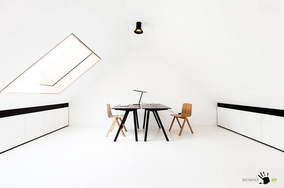 На верхнем уровне частного дома находится кабинет, минималистской обстановке которого могли бы позавидовать сами создатели стилистики. Абсолютно белоснежная отделка размывает границы конструкций и предметов, лишь черная окантовка систем хранения и письменные столы вносят контрастную четкость в интерьер комнаты на мансарде.