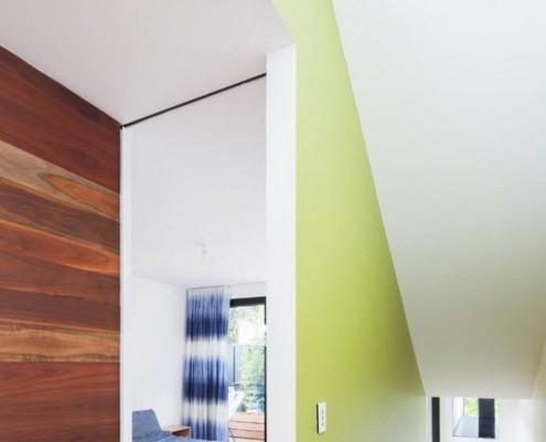 Для оформления прихожей, коридора или любого другого помещения в загородном доме использование деревянных настенных панелей для отделки стен – частый дизайнерский прием. Окрашивание таких поверхностей в зеленый цвет совместно с использованием мебели из светлых пород древесины, дает потрясающий по колоритности результат.