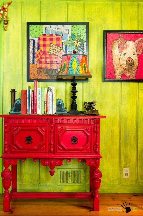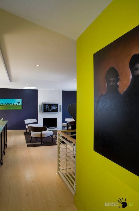 Для больших оригиналов и достаточно смелых домовладельцев можно предложить сочетание яркого оттенка зеленого, например, цвета лайма или салатового, с не менее колоритным по яркости оттенком. Подобная комбинаторика сразу продемонстрирует любому входящему в ваше жилище тот факт, что интерьер этого дома скучным не будет. Яркие, колоритные оттенки способны не только привнести позитивный настрой в интерьер помещения, но и зарядить тонусом домочадцев на целый день.