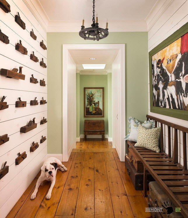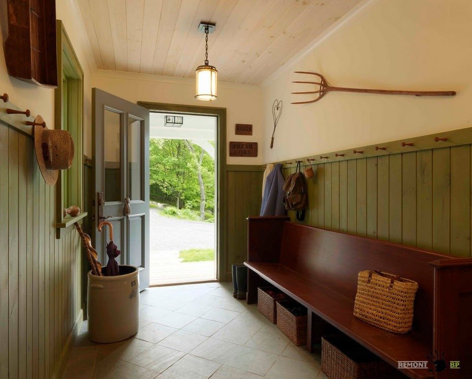 Для стиля кантри в оформлении прихожей можно использовать следующие цветовые вариации – зеленые оттенки для исполнения реечного фартука, светло-бежевая палитра для окрашивания верхней части стен и потолочного покрытия, а темные деревянные поверхности – для меблировки. Сама природа отражена в этом дизайне.