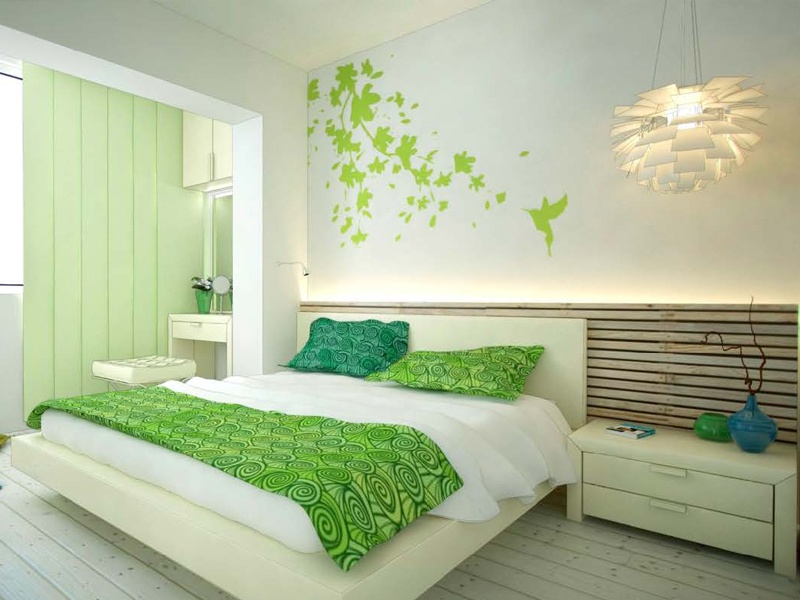 Разнообразие зелёной палитры приятно впечатляет. Поэтому при оформлении интерьера спальни вы можете использовать абсолютно разнообразные оттенки. К примеру, светлые тона автоматически наполняют помещение спальни ощущением спокойствия и безмятежности.