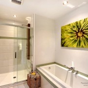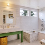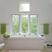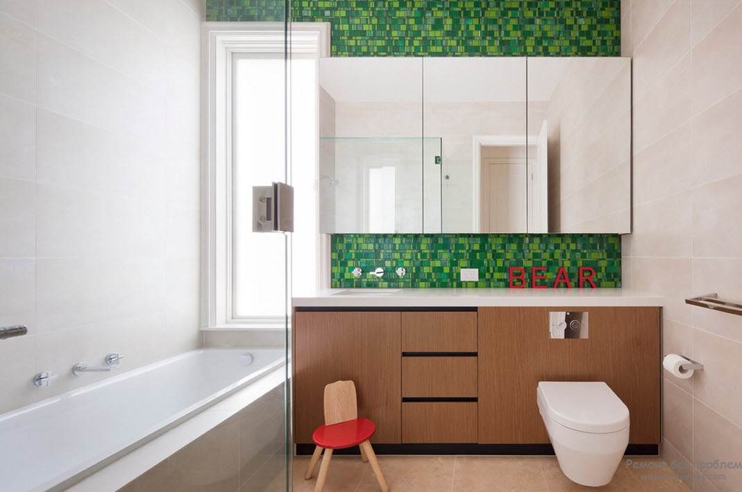 Неплохим вариантом будет оформление зеленым цветом только одной стены, т.е. как бы ее подчеркивание и акцентирование. Если в ванной комнате имеется окно, то рамы желательно сделать белыми, а также добавить дополнительные белые акценты в интерьере.