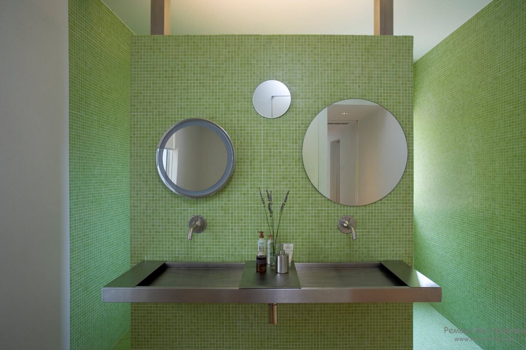 Для отделки стен, например, очень хорошо будет смотреться популярная ныне зеленая плитка-мозаика, имеющая эффект мерцания, и добавляющая элитарности. Кстати, что касается стоимости, то она равна стоимости хорошей кафельной плитки. Правда, укладывается она чуть посложнее.