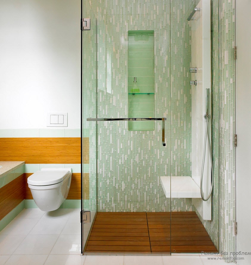 В идеале потолок и пол должны меть самые светлые оттенки. Сантехника и мебель в классическом понимании оформления зеленого интерьера должны быть белыми. А если имеется прозрачная душевая кабина, то на зеленом фоне стен она будет смотреться идеально