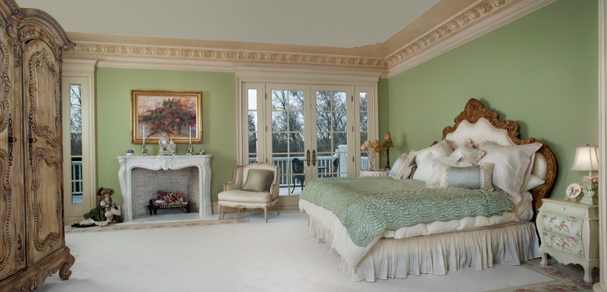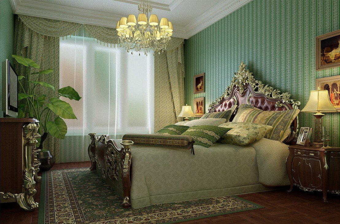 Хорошо будет выглядеть спальня в зеленом цвете в классическом интерьерном стиле. Ведь классический стиль актуален практически всегда. Что должно быть в таком стиле? Качественные, красивые обои желательно спокойного зеленого цвета или оттенка, красивые тяжелые шторы с ламбрекенами и различными красивыми украшениями, качественные столешницы, обивка стульев и мебели также должна быть качественной и дорогой. Неплохо будут смотреться красивые дорогие вазы из зеленого стекла. Керамики зеленых оттенков и т.д.