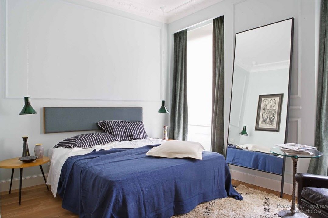 Для большой спальной комнаты зеркало может послужить «окном». Крупные зеркала располагают на полу у стены, компенсируя недостатки маленьких окон.