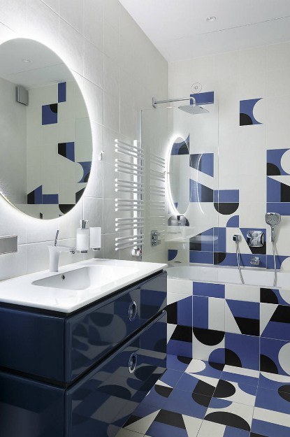 При отделке стен ванной комнаты можно использовать зеркальную тему двумя наиболее распространенными способами. Первый – размещение отдельного зеркала в плиточной кладке, второй способ – отделка стен зеркальной плиткой. Зеркало в плитке – бюджетный, доступный и оригинальный вариант. Зеркальная плитка, несомненно, смотрится роскошно и необычно, зрительно расширяет пространство ванной комнаты, но отличается высокой стоимостью и хрупкостью. Тем не менее, оба варианта достаточно часто встречаются в современных интерьерах ванных комнат.
