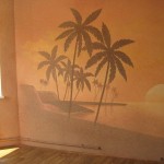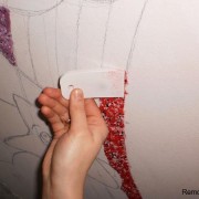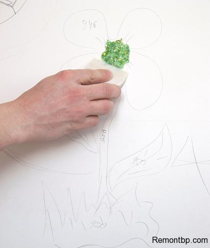 - При помощи небольшого шпателя наносим смесь толщиной 2-3 мм на стену, стараемся сделать так, чтобы смесь заходила за контур рисунка на 1-2 мм;