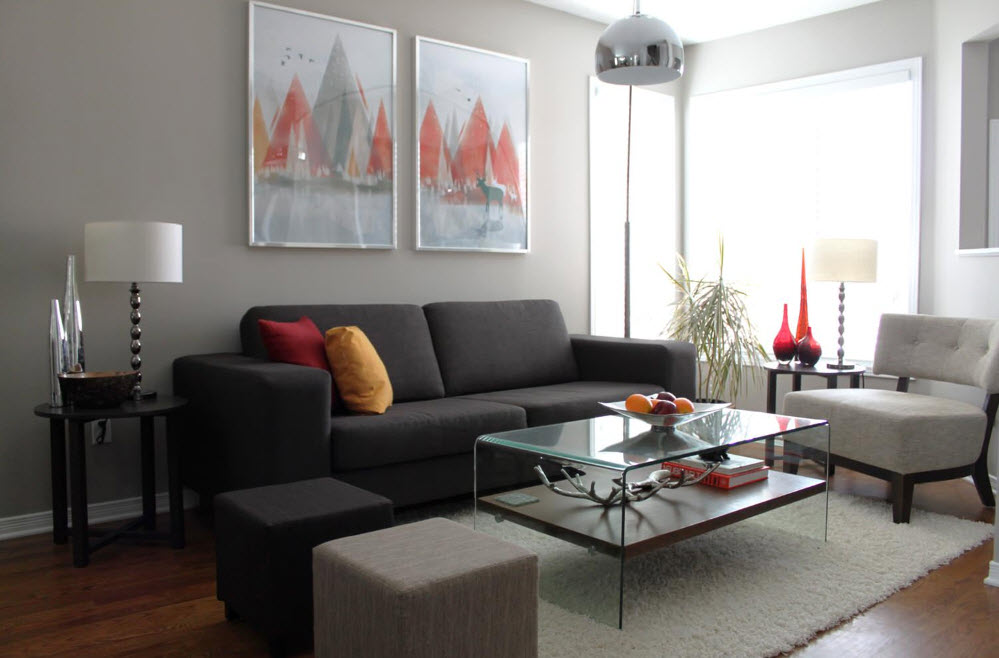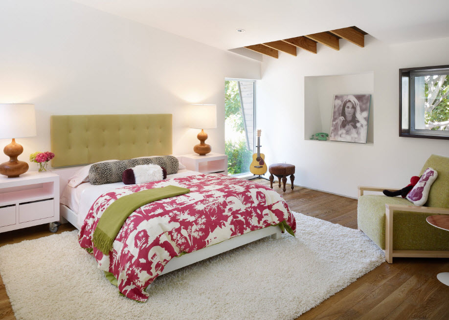 Если пространство комнаты позволяет, можно не ограничиваться лишь установкой кресел и использовать диван компактной модели. С точки зрения исполнения мягкой мебели, необязательно, чтобы диван и кресла имели одинаковую обивку и дизайн. Оригинального внешнего образа можно добиться, используя различные цвета в исполнении предметов меблировки, но сочетающиеся с текстилем оформления спального места и декорирования оконных проемов.