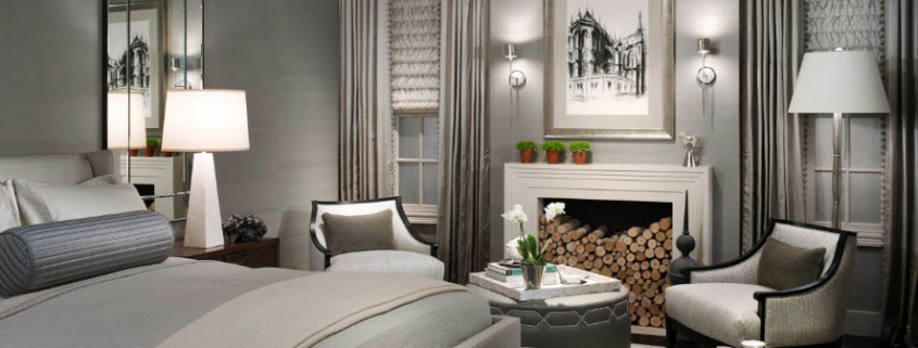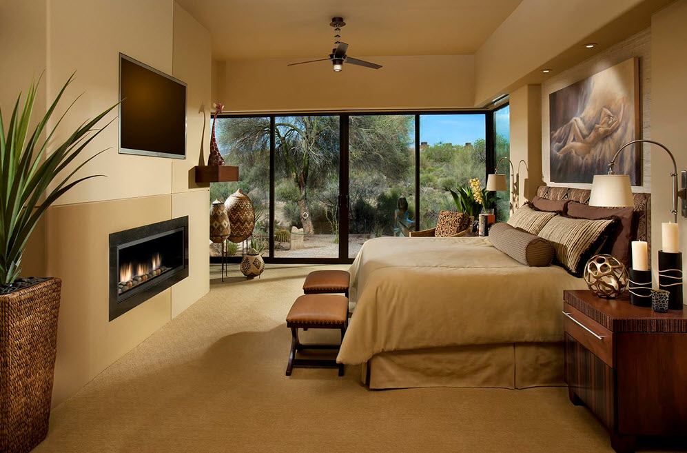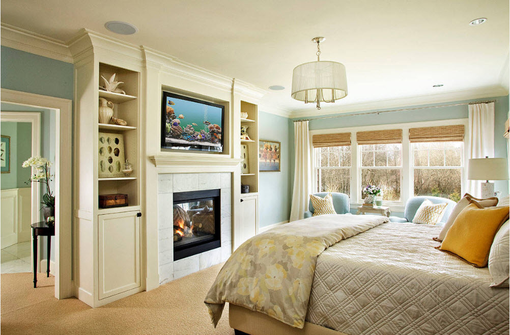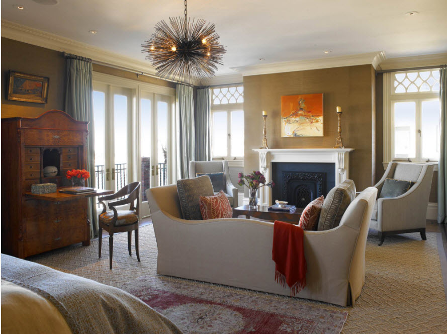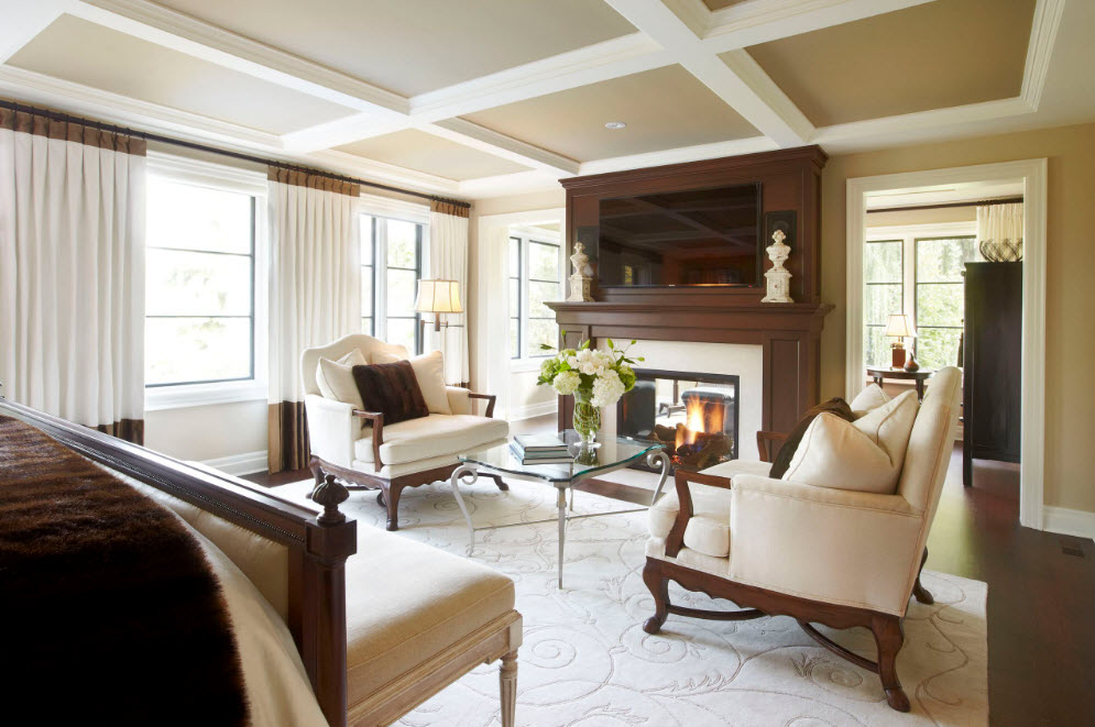 Если в спальне есть камин (или его эффектная имитация), то вполне логично расположить зону гостиной возле очага. Пара уютных кресел у очага, кофейный столик и напольный торшер для вечернего чтения – создать идеальную зону для отдыха можно и в спальне.