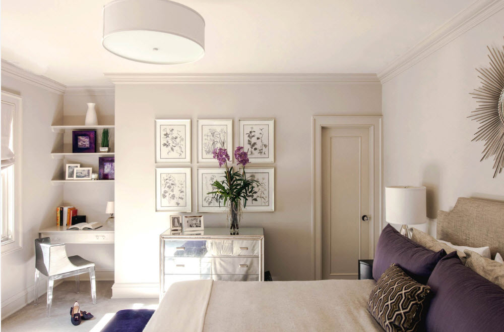 Помимо зоны отдыха, в просторной спальне можно расположить небольшое рабочее место. Современные гаджеты невероятно компактны – для организации компьютерного стола достаточно неширокой консоли, которая крепится прямо к стене. Становите рядом удобное кресло или стул со спинкой и мягким и сидением – сектор домашнего офиса готов. Удобство подобных зон в том, что рабочее место можно использовать и в качестве туалетного столика – повесьте над консолью зеркало или используйте изделие на гнущемся штативе и место для создания ежедневного образа готово.