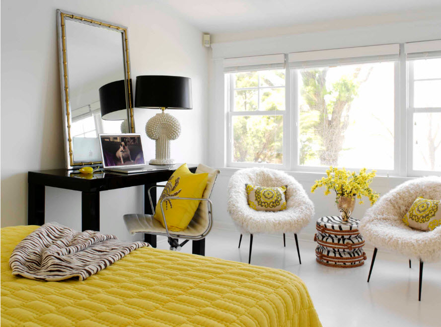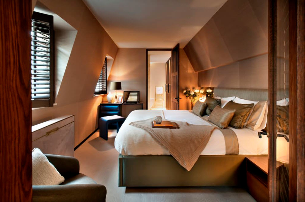 Для спален, имеющих большую длину, рациональным станет расположение зоны отдыха у изножья кровати. При размещении спинок кресел вплотную к изножью и установки небольшого столика-подставки между ними, экономится полезное пространство комнаты для сна и отдыха.