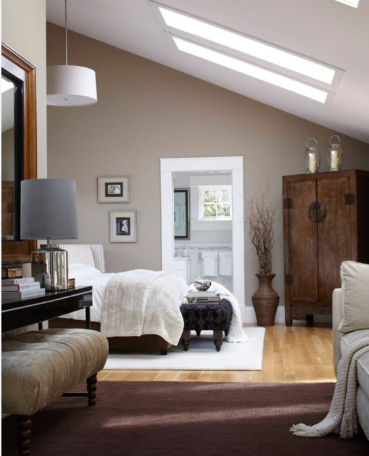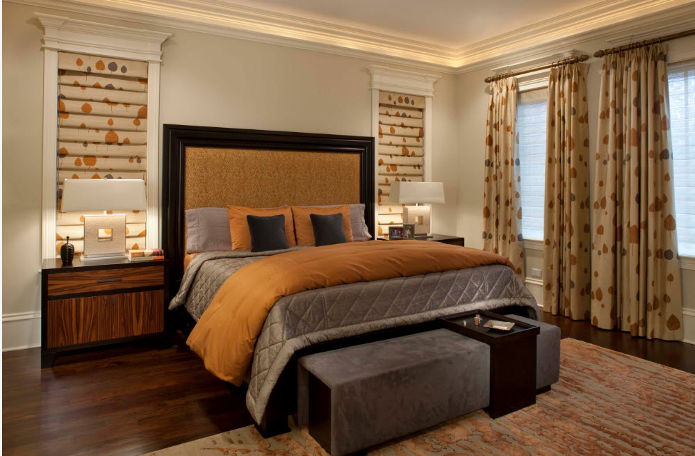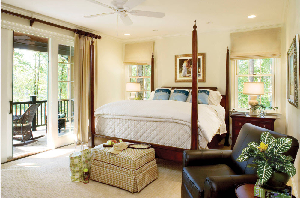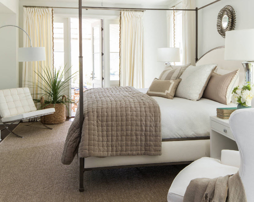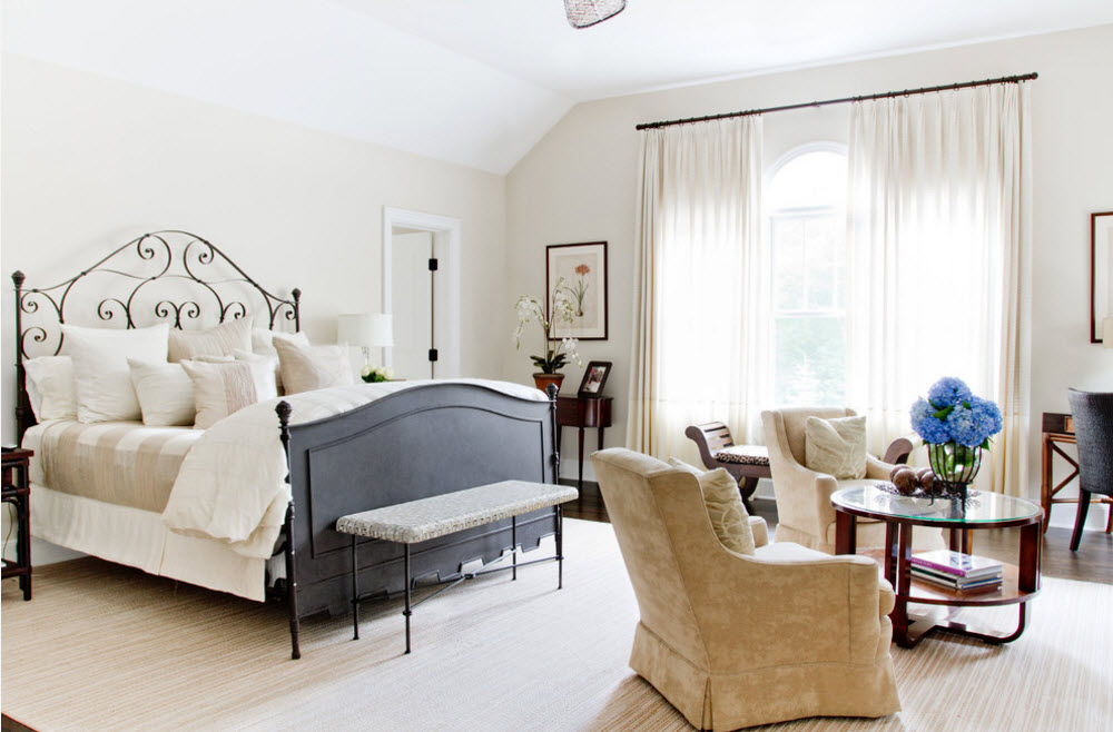 Наиболее логичным расположением кресел или дивана гостиной зоны, находящейся в спальне, можно считать место у окна. И не только потому, что это пространство не используют для расположения кровати (не говорим об исключительных случаях малогабаритных помещений). В результате такой планировки, мы получаем не только место для отдыха и приватных бесед, но и комфортную зону для чтения. В дневное время здесь достаточно естественного освещения, для вечерних сумерек необходимо предусмотреть наличие источника искусственного света – напольный торшер станет отличным вариантом.