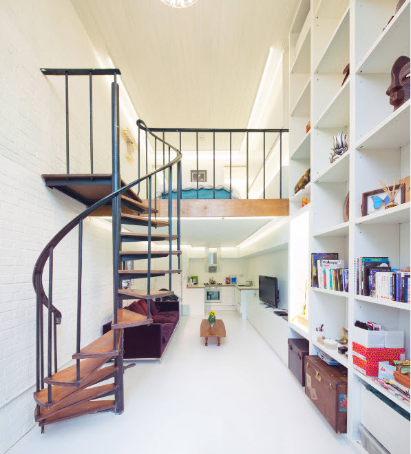 Один из способов разделения функциональных сегментов в рамках одного помещения – выделение непросто сектора, а целого яруса. Для помещений с высокими потолками возможно выделение верхнего уровня для расположения спального места прямо над гостиной. При этом зона спальни может иметь совсем небольшие габариты – для размещения кровати необходимо совсем немного свободного места, да и высота потолков существенной роли не сыграет, лишь бы до сальной зоны можно было добираться с комфортом.