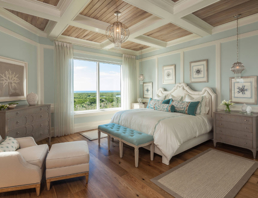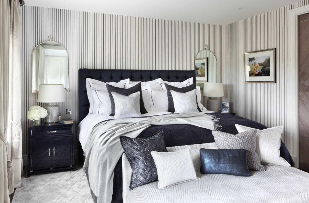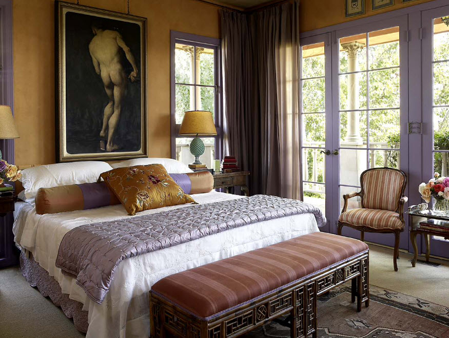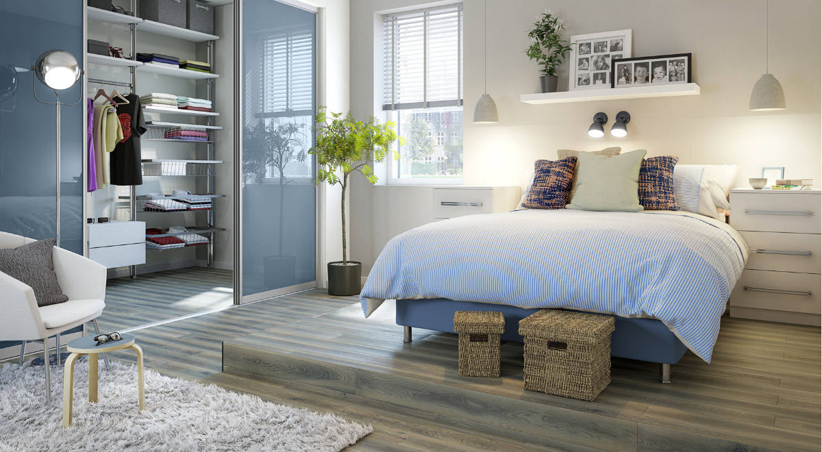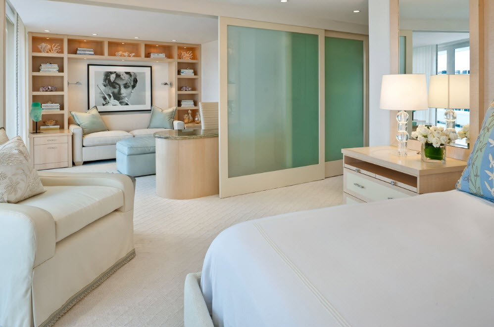 Кроме зоны отдыха, в спальне с большой площадью можно расположить гардеробный сегмент. В этом случае есть несколько вариантов размещения систем хранения в спальном пространстве. Например, можно закрыть гардеробную за стеклянными раздвижными дверями, которые практически не будут препятствовать проникновению света в зону хранения, но при этом четко очертят границы функционального сегмента. Многим домовладельцам нравится идея использования шторок, невысоких ширм, которые идеально подойдут для интерьера, оформленного в восточном стиле. Также есть любители свободного пространства, которые предпочитают не ограничивать зоны помещения спальни каким-либо вариантами перегородок и оставлять пространство свободным для беспрепятственного трафика.