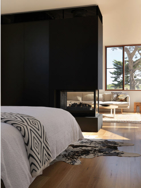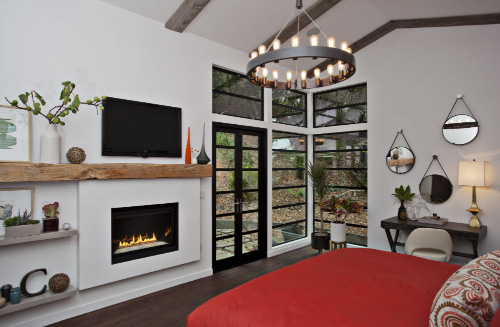 Иногда в качестве перегородки между спальней и гостиной можно встретить сооружение, в которое эффектно вписаны не только системы хранения, но и двусторонний камин. Помимо очевидного разделения пространства на секторы, обе функциональные зоны получают примечательный элемент интерьера, наблюдение за которым способно умиротворить и расслабить – камин с огнем.