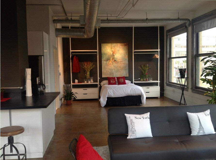 Но для многих дизайнеров и домовладельцев любое ограждение функциональных сегментов неприемлемо – только свободная планировка, позволяющая сохранить ощущение простора и свободы даже в помещениях среднего размера. Как правило, в подобных пространствах зона спальни ничем не ограничивается. Общая отделка поверхностей, выбор текстиля и декора, лишь осветительные системы необходимо оборудовать для каждого функционального сегмента. Например, стиль лофт приемлет только такой вариант планировки в просторном помещении.