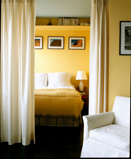 Масштабы некоторых гостиных позволяют зонировать спальный сектор за стеклянными перегородками. Если оснастить такие перегородки шторами, то можно в любой момент добиться исключительной приватности спальной зоны. Одернув шторы, вы получаете пространство, в которое проникает естественный свет из гостиной (своего окна у спального сегмента нет по очевидным причинам).